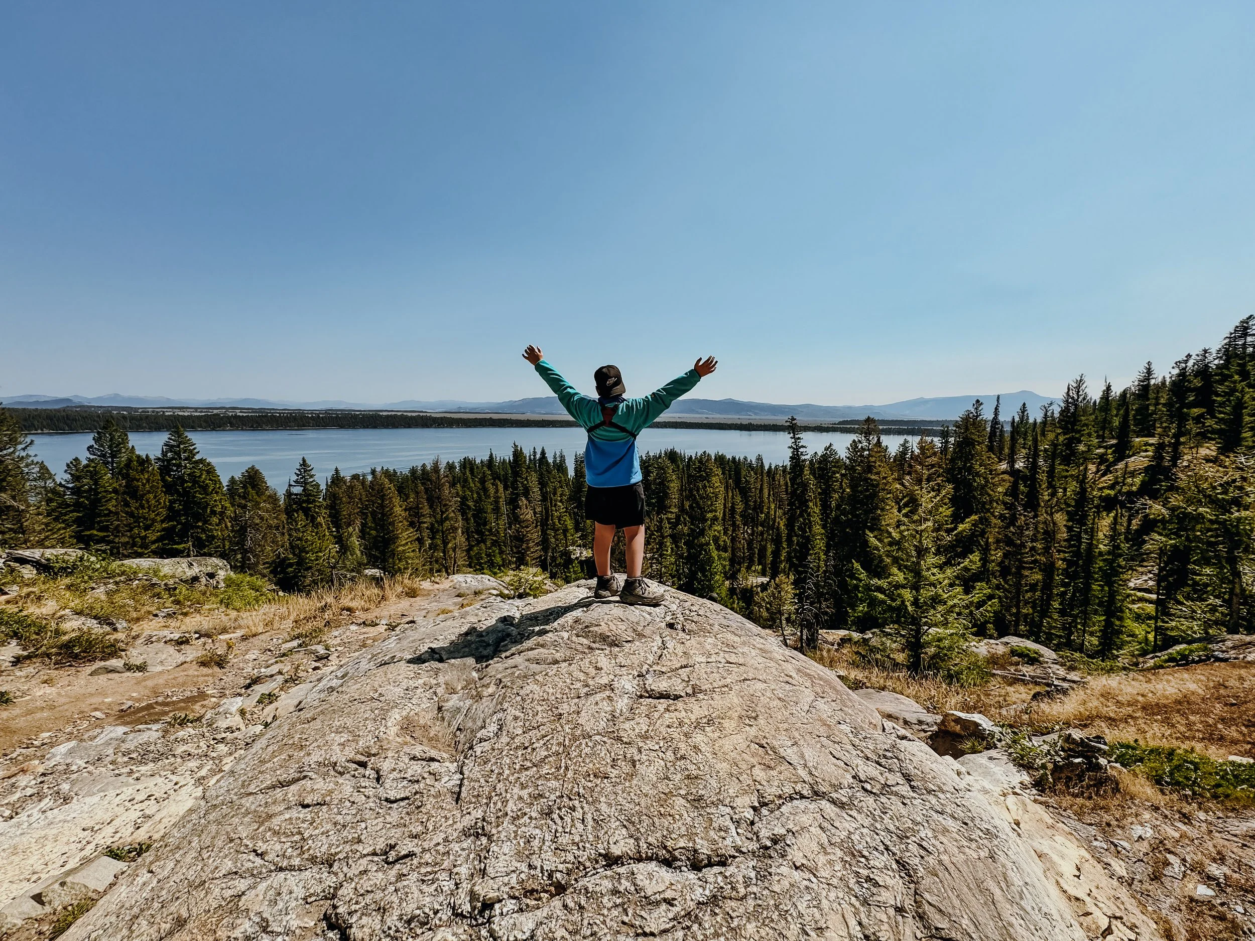 Once you’ve parked, head to Jenny Lake and hike to Hidden Falls and Inspiration Point. You can hike the entire way or take the boat shuttle to shorten your journey. We chose to hike the whole way and loved it. I recommend hiking clockwise around the lake, reaching Inspiration Point and Hidden Falls, and then taking the boat shuttle back. This loop is approximately 3.8 miles with a 500-foot elevation gain, including a section of rock stairs and steep switchbacks. It’s a moderate hike that young and older kids can handle with relative ease. And if you’re lucky, you might literally stumble upon a moose (safely, of course!). We turned a corner and found ourselves face-to-face with a laid-back moose, lazily chewing his cud and watching his curious spectators. Knowing moose can be aggressive, I approached with caution. But after observing him in his relaxed state, we followed the lead of other hikers and carefully crossed past him. It was an unforgettable encounter!
