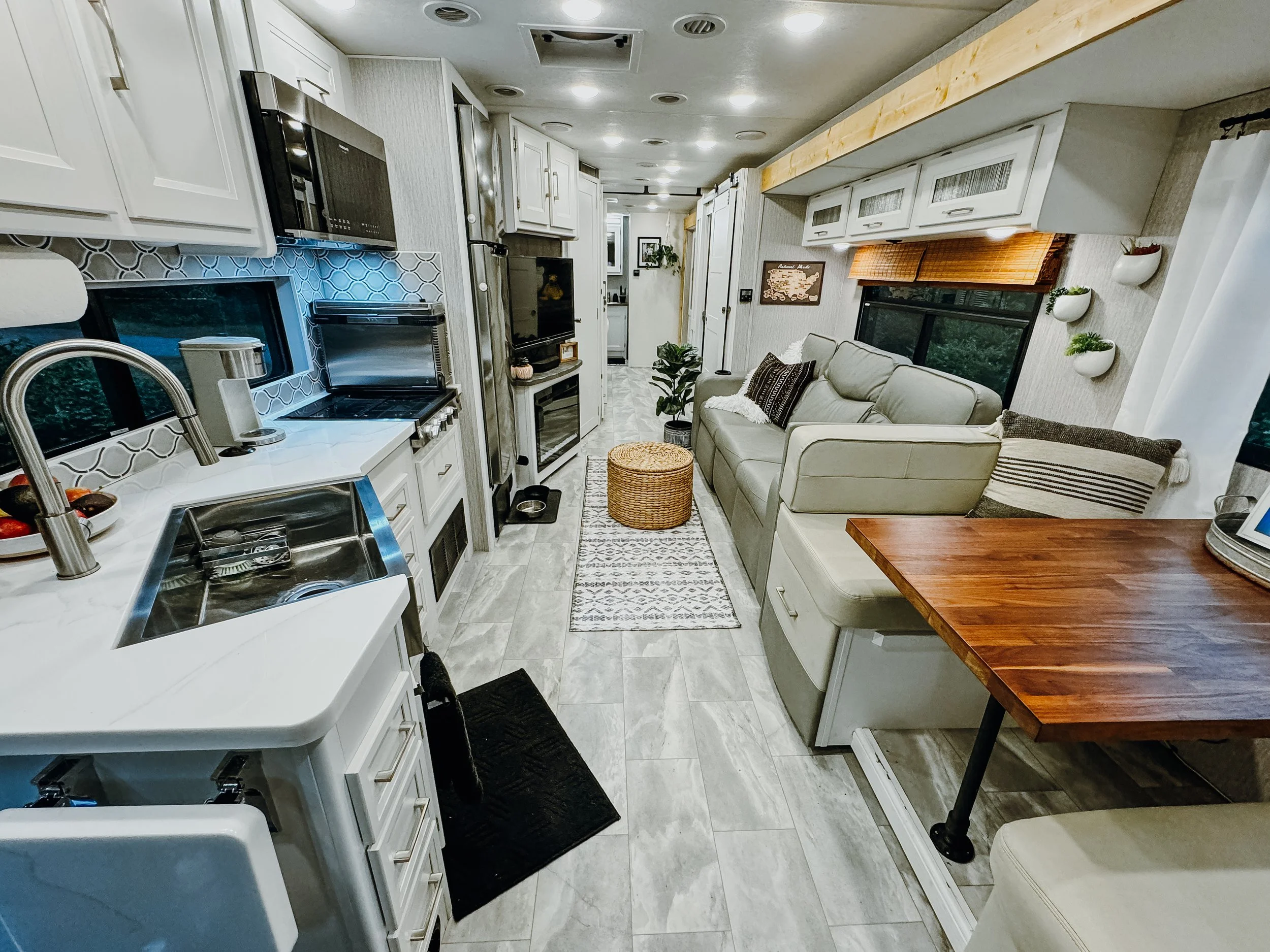 Drew works out of the RV too, where we’ve set up a compact office space by converting the TV into a desktop screen and using a collapsible table as his desk. Sometimes, he’ll work from coffee shops or outside, as long as there’s internet access. Living in a motorhome has given us the flexibility to travel while still having the comforts of home when we need them.